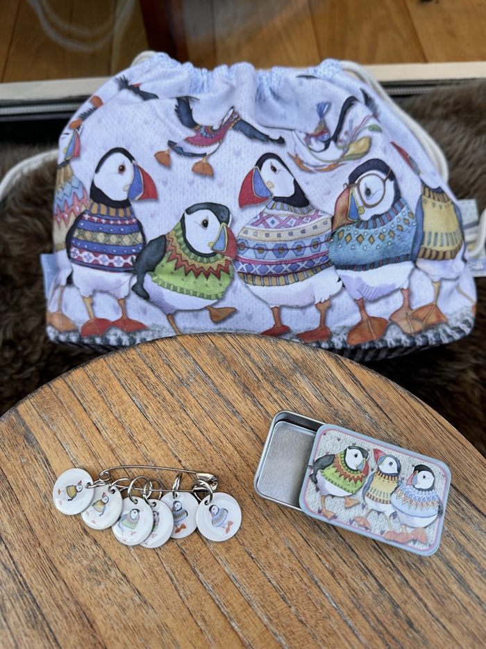 Dette særlige juletilbud består af en projektpose med søpapegøjer i sweatre, samt en lille æske med glidelåg.