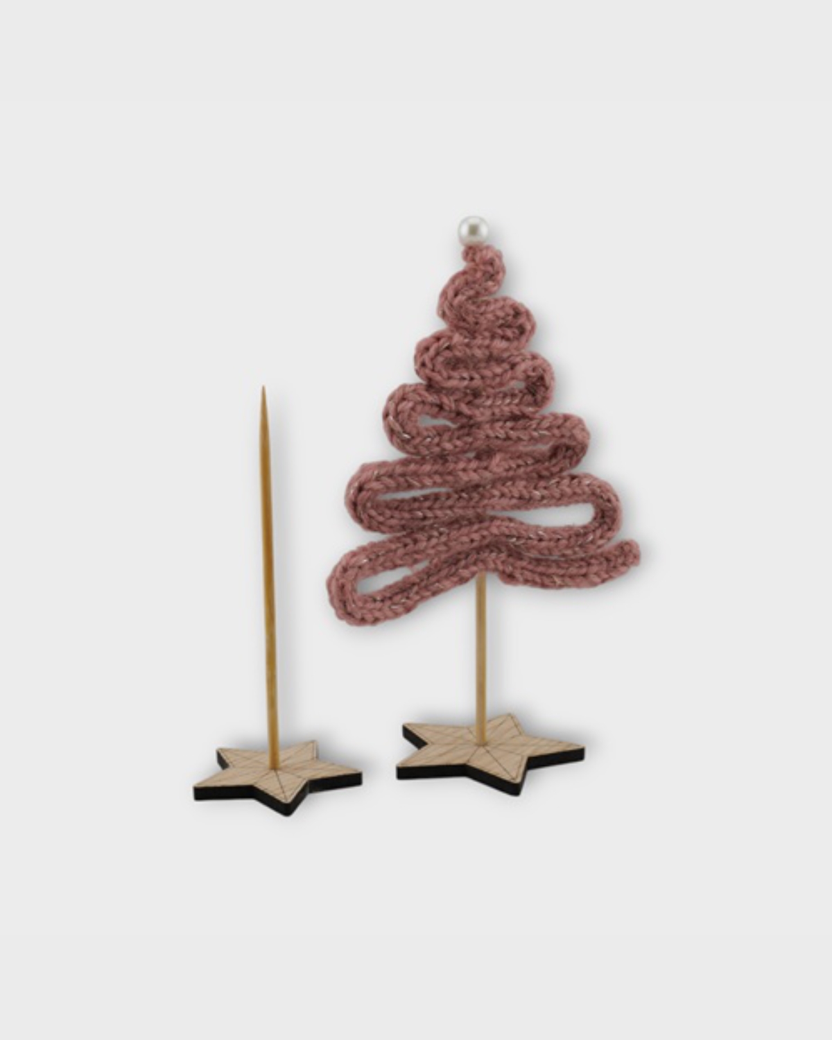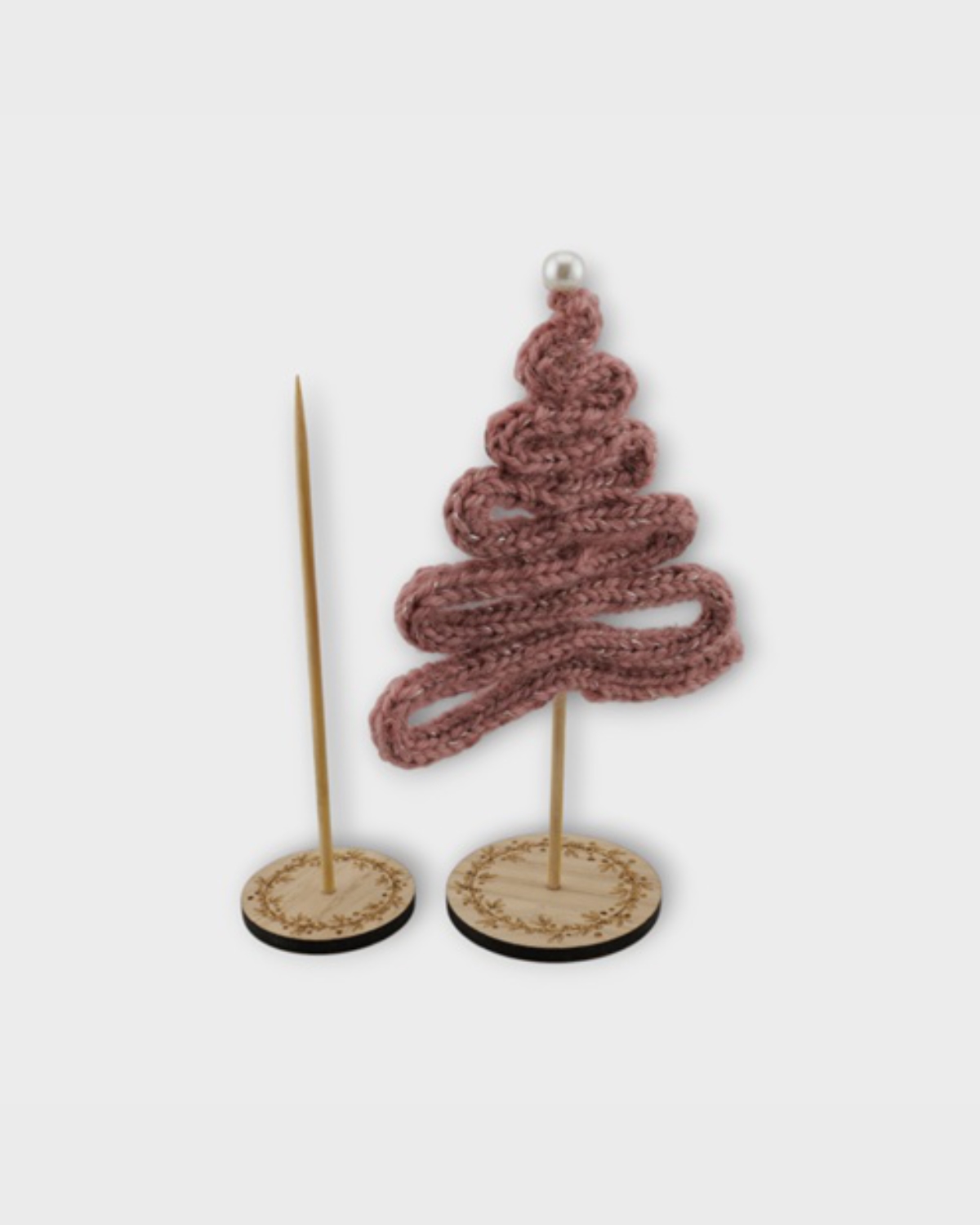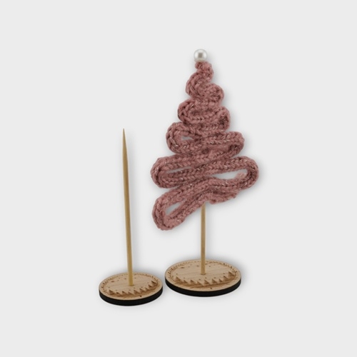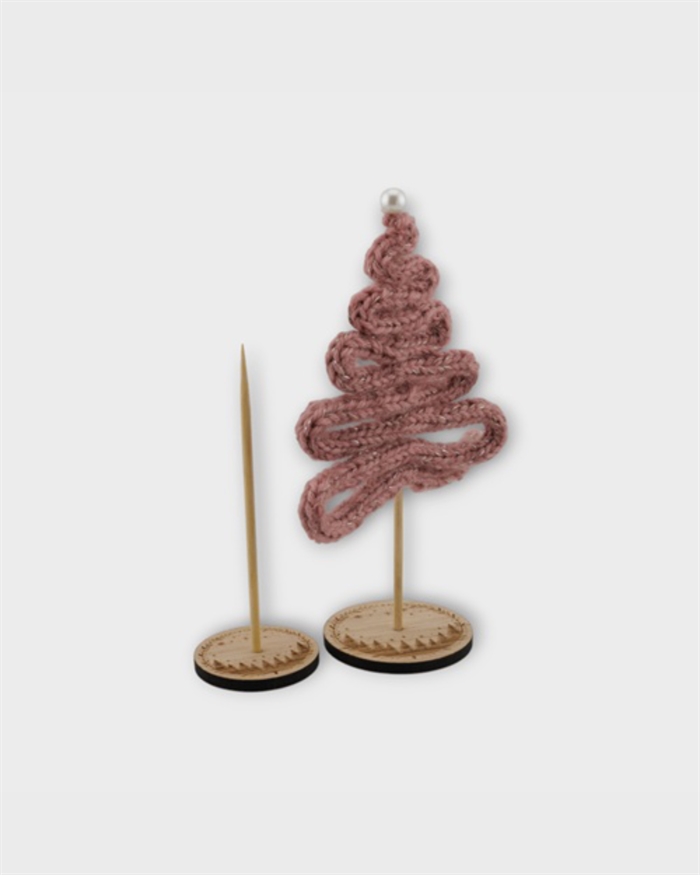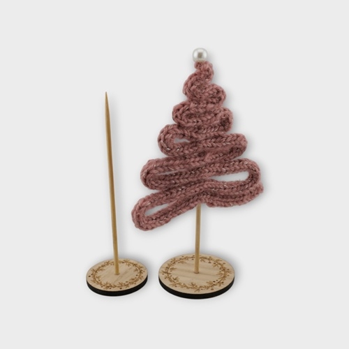 Smuk fod i egetræsfiner med motiv – perfekt til de små strikkede juletræer.