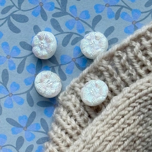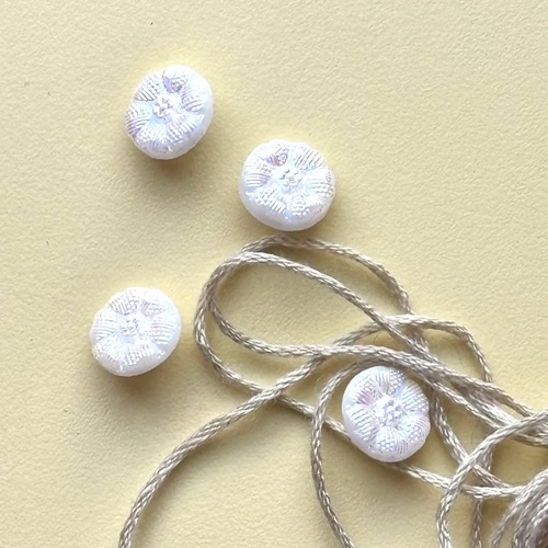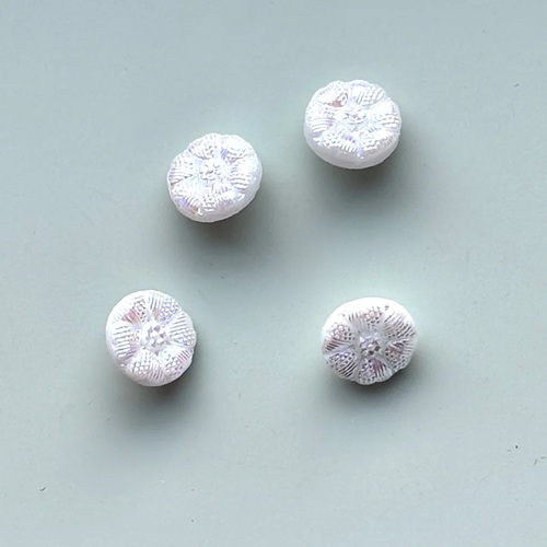 Den mindste glasknap, dekoreret med et fint blomstermotiv. Knappen er støbt i mat hvidt krystalglas og afsluttet med en elegant perlemorsfinish, som smukt opfanger og reflekterer farverne i omgivelserne. Den lille knap er perfekt i en skjorte eller en barne trøje hvor der skal bruges en lille knap