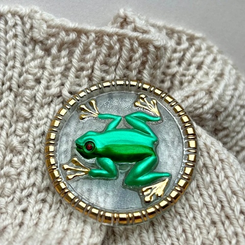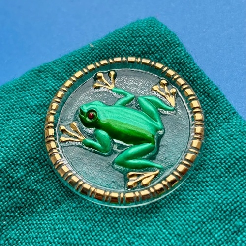 En eventyrlig knap med den fineste håndmalet frø med smukke guld detaljer, knappen er meget unik støbt i let klart krystal glas og dekorativ på tøj som lukning eller som en fin broche med anvendelse af en lille knappe clips.