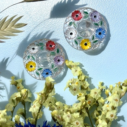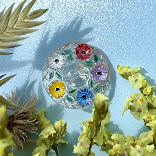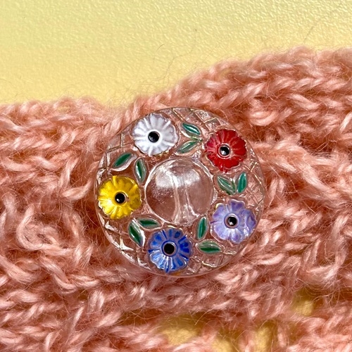 Fineste håndmalede glasknapper i klart transparent glas med håndmalede blomster mønster og guldbelægning på toppen. Den fine glasknap som vil være en fin detalje til ethvert håndlavet projekt, en ægte unik blomster bling-knap som er let og nem at montere fx på en Agnete cardigan.