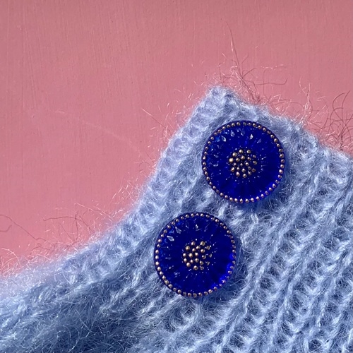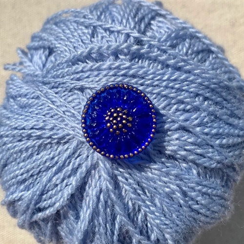 Elegant lille blomster glasknap med solsikke motiv i en smuk mørk cobaltblå farve, Solsikkeknappen er håndmalet i et guld mønster som giver ekstra bling når lyset rammer den fine knap. Glasknappen i den mørke farve passer fint til strik eller på en jakke som prikken over iét på dit krea projekt.