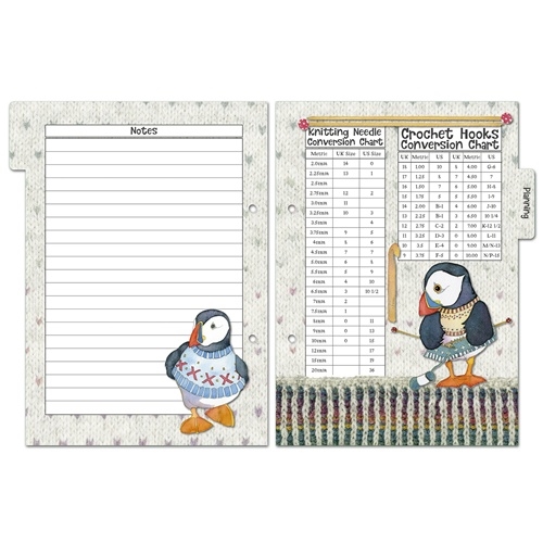 Fem faneblade med information og plads til noter (pindestørrelse, forkortelser og garntykkelser)